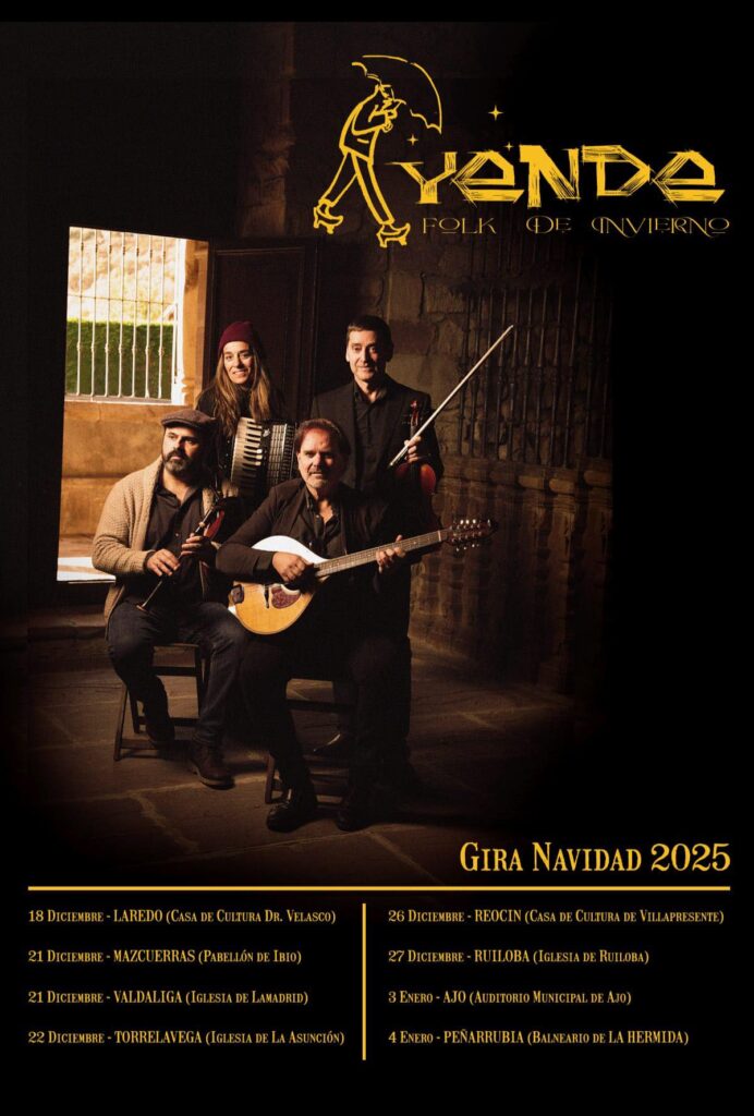 El nuevo grupo Yende, compuesto por Lissy Nuñez, Marcos Bárcena, Nico Toral y Chema Murillo, nos informan de sus conciertos de Navidad. El jueves 18 de diciembre a las 19.30 en la Casa de Cultura Doctor Velasco de Laredo, el domingo 21 a las 13.00 en el pabellón de Ibio (Mazcuerras) y en la Iglesia de Lamadrid a las 19.00, el lunes 22 a las 20.00 en la Iglesia de la Asunción de Torrelavega, el viernes 26 a las 19.00 en la Casa de Cultura de Villapresente, el sábado 27 a las 19.00 en la Iglesia de Ruiloba, el sábado 3 de enero a las 19.00 en el Auditorio de Ajo y el domingo 4 de enero a las 19.00 en el Balneario de la Hermida ( Peñarrubia)