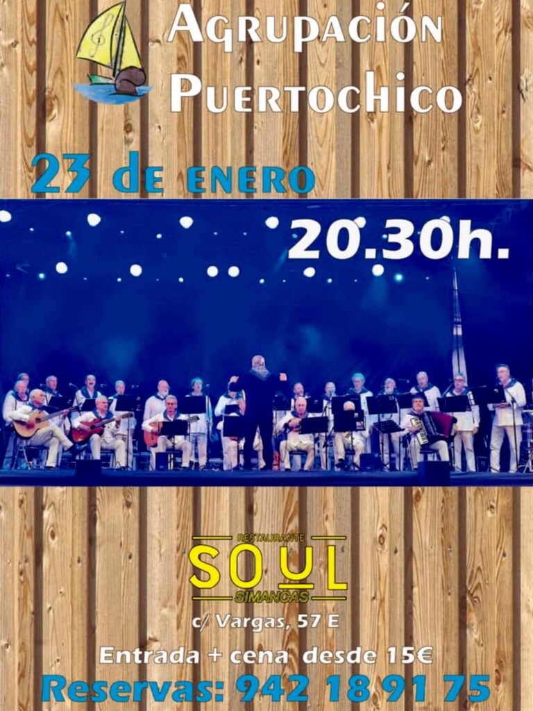 Agrupación Puertochico en el Soul Simancas. Viernes 23 de enero, 20.30 Posted on January 19, 2026 by Pablo La Agrupación Puertochico actuará el viernes 23 de enero desde las 20.30 en el Restaurante Soul Simancas de la calle Vargas, en Santander Post navigation « Coro Ronda Garcilaso y Piteros del Lobio en El Refugio. Viernes 20 de febrero, 20.30Hevia en el Teatro Casyc. Viernes 23 de enero, 19.30 »
