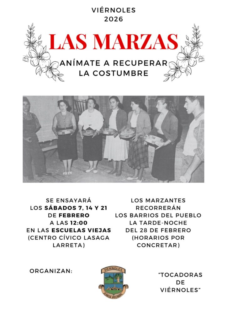 Marzas en Viérnoles. Sábado 28 de febrero Posted on February 3, 2026 by Pablo Las Tocadoras de Viérnoles organizan el canto de marzas en su localidad. Se ensayará los sábado 7-14 y 21 de febrero desde las 12.00 en las Escuelas Viejas. Y el sábado 28 durante la tarde-noche se cantarán las marzas por los barrios del pueblo. Post navigation « El Puesto de Vicente sigue colaborando con www.folk-cantabria.comAdolfo Díaz Losúa es nombrado “Marcero Mayor 2026” por la Ronda Marcera de Torrelavega »