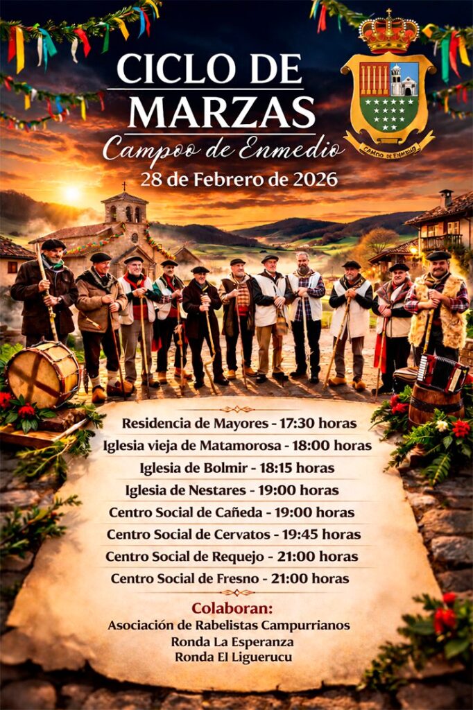 Asociación de Rabelistas Campurrianos, Ronda La Esperanza y Ronda El Liguerucu cantarán las marzas el sábado 28 de febrero en Campoo de Enmedio, comenzando a las 17.30 en la residencia de mayores y finalizando a las 21.00 en el Centro Social de Fresno del Río