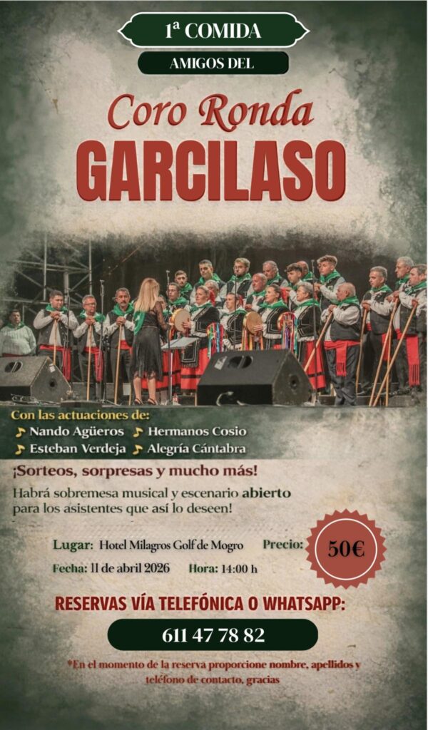 El sábado 11 de abril desde las 14.00 tendrá lugar la Primera Comida Amigos del Coro Ronda Garcilaso en el Hotel Milagros Golf de Mogro. Con las actuaciones de Nando Agüeros, Hermanos Cosio, Esteban Verdeja y Alegría Cántabra, con sobremesa musical y escenario abierto para todo el que quiera participar, con sorteos, sorpresas y mucho más. Más información y reservas en el teléfono 611477882